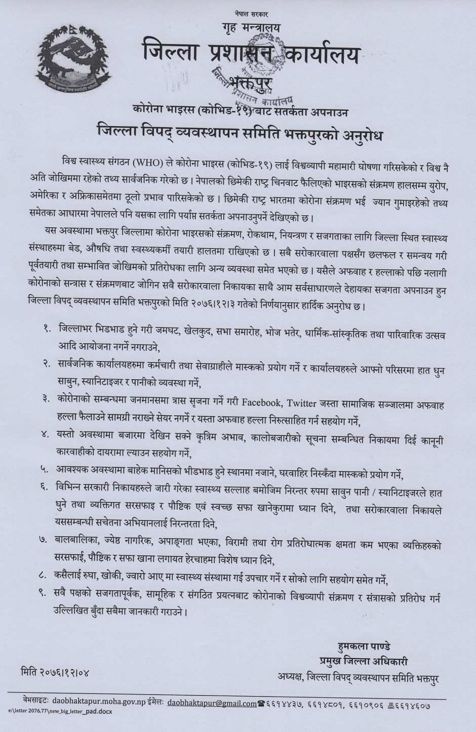 मिति २०७६ चैत्र ३ गते बसेको जिल्ला विपद् व्यवस्थापन समिति, भक्तपुरले गरेको निर्णयहरूः