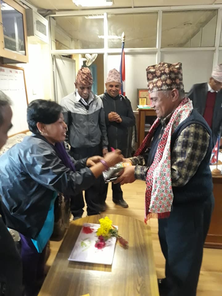 प्रमुख जिल्ला अधिकारी श्री रोशनी कुमारी श्रेष्ठज्यूलाई विदाइई गर्नु हुदै सहायक प्रमुख जिल्ला अधिकारी डोरेन्द्र निरौला