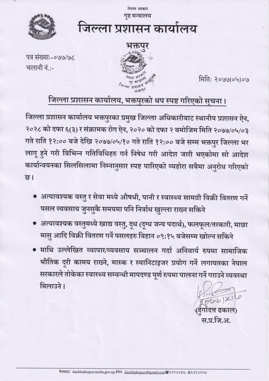जिल्ला प्रशासन कार्यालय, भक्तपुरको थप स्पष्ट गरिएको सूचना (२०७७।०५।०७, १७:४६ बजे)