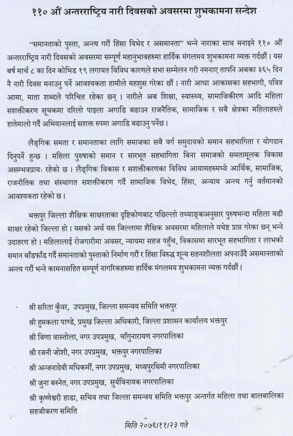 ११० औं अन्तरराष्ट्रिय नारी दिवसको अवसरमा शुभकामना सन्देश