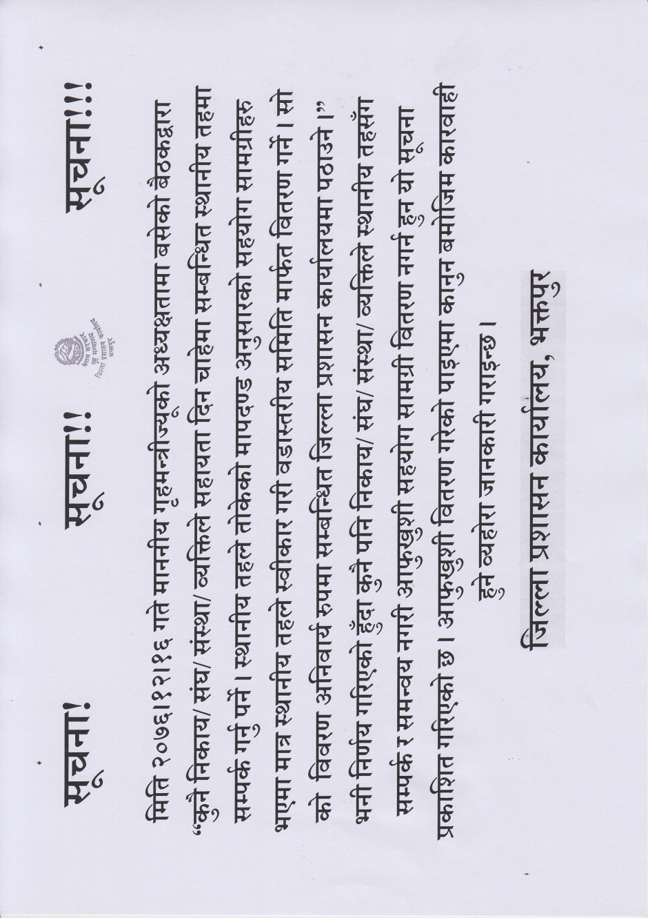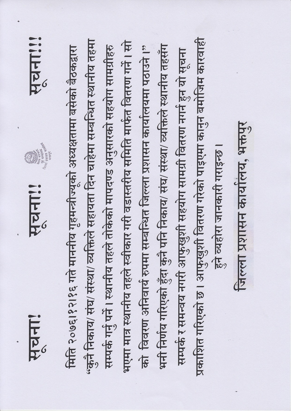 कुनै पनि निकाय/ संघ/ संस्था/ व्यक्तिले स्थानीय तहसँग सम्पर्क र समन्वय नगरी आफुखुशी सहयोग सामग्री वितरण नगर्न हुन यो सूचना प्रकाशित गरिएको छ ।