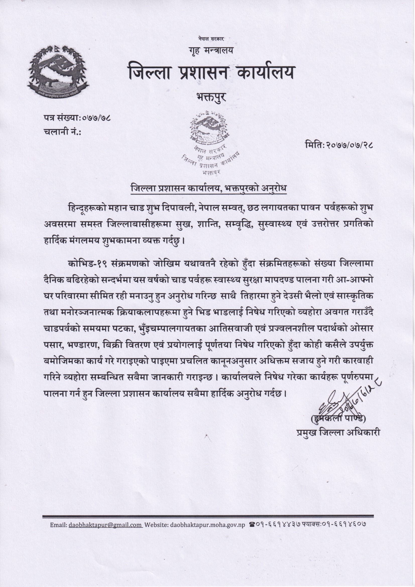 जिल्ला प्रशासन कार्यालय, भक्तपुरको बिशेष अनुरोध २०७७।०७।२८