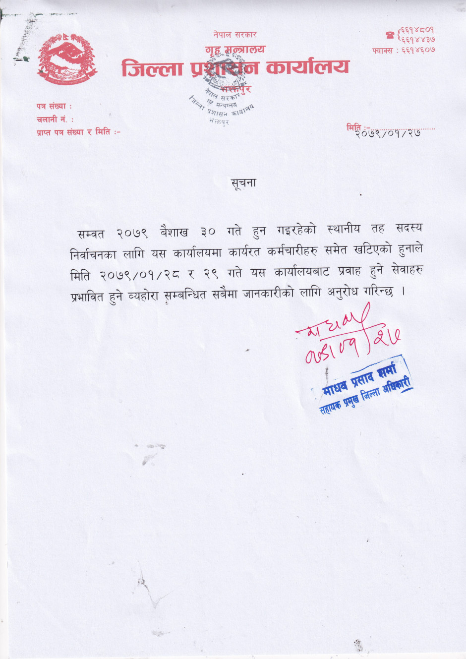 जिल्ला प्रशासन कार्यालय, भक्तपुरबाट जारी सूचना
