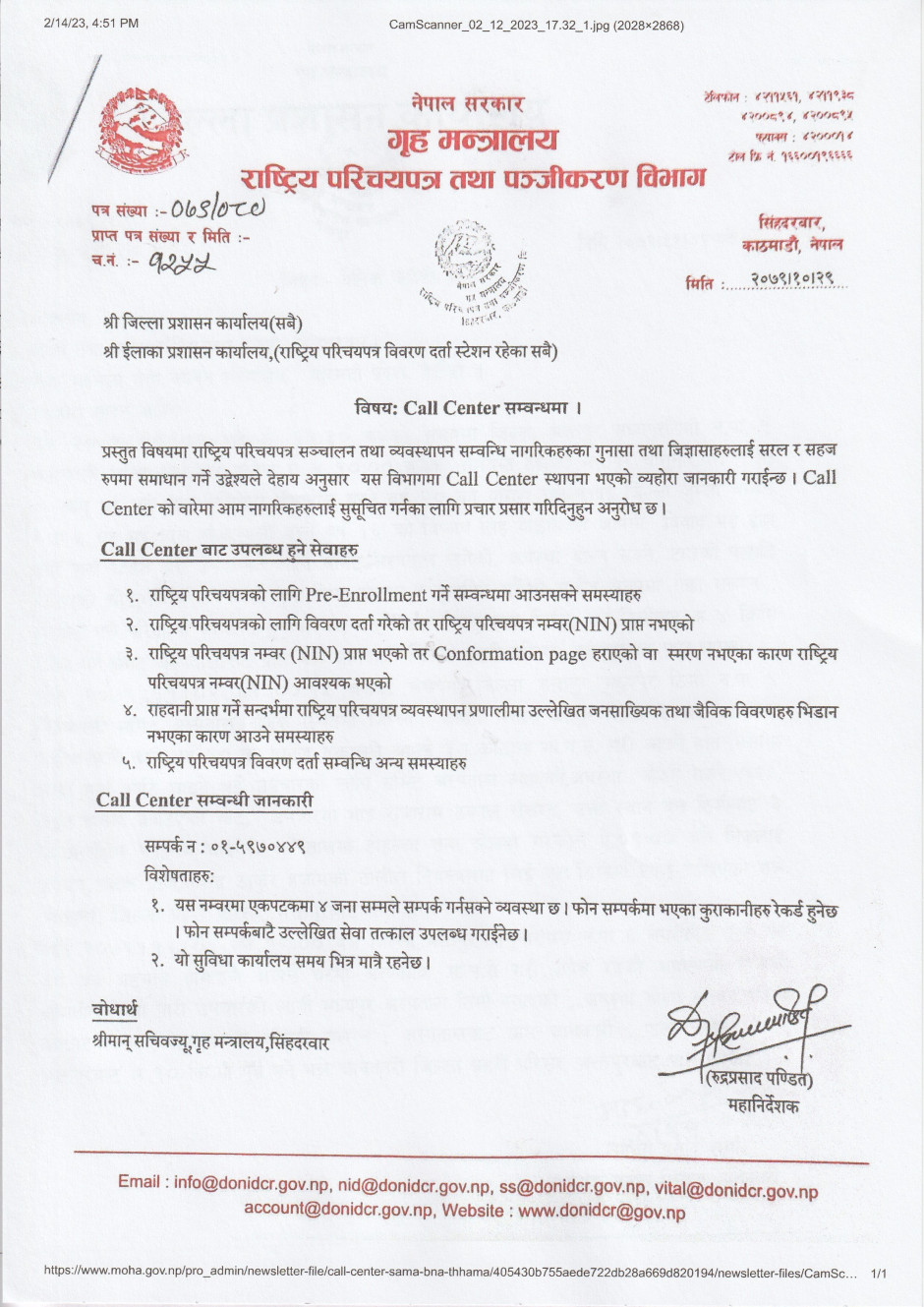 राष्ट्रिय परिचय पत्र सम्बन्धी गुनासा तथा जिज्ञासाहरुको समधान सम्बन्धी सूचना