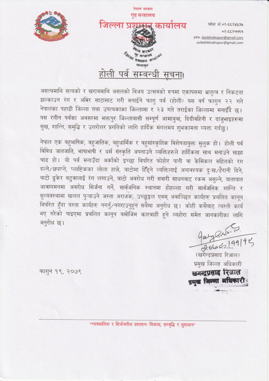 होली पर्व मनाउने सम्बन्धी सूचना
