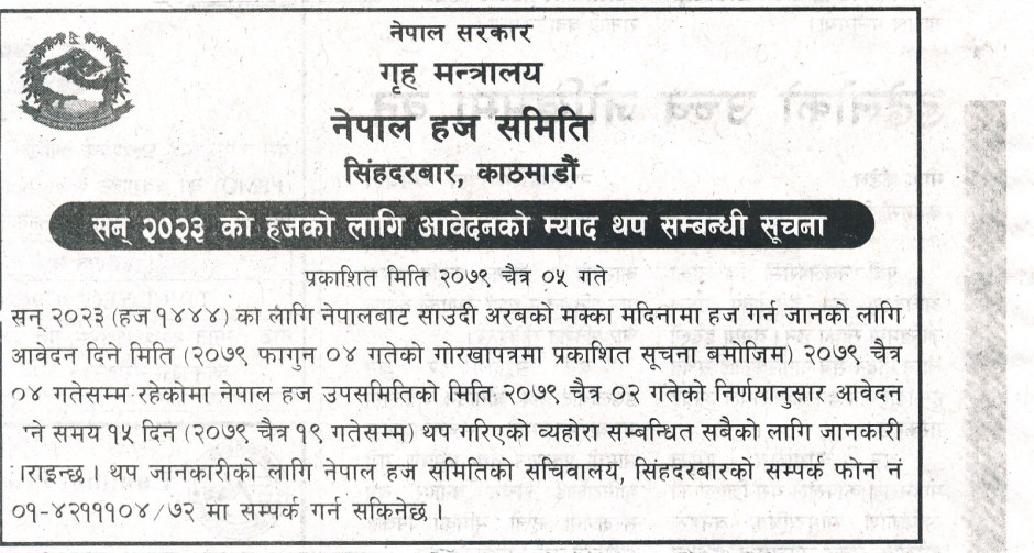 तस्बिर : सन् २०२३ को हजको लागि आवेदन म्याद थप सम्बन्धी सूचना