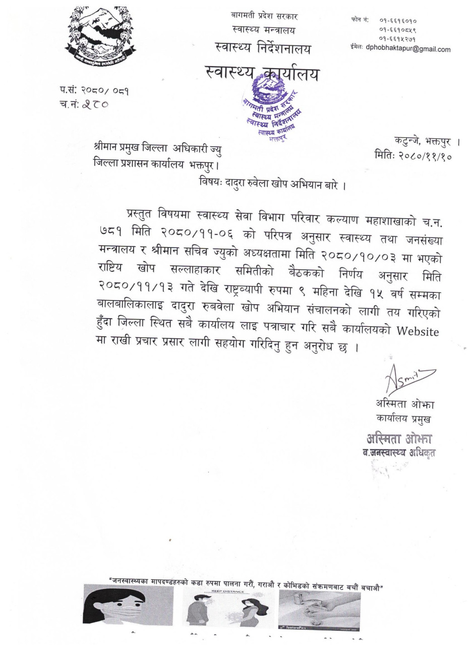 मिति २०८०/११/१३ गते देखि राष्ट्रव्यापी रुपमा ९ महिनादेखी १५ वर्षसम्मका बालबालिकाहरुलाई दादुरा रुवेला खोप अभियान सञ्चालन सम्बन्धी सूचना