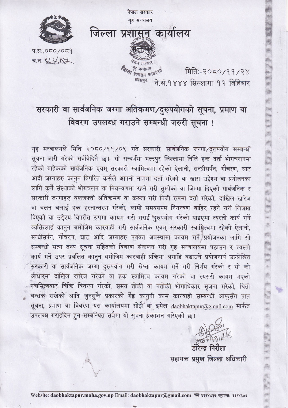 सरकारी वा सार्वजनिक जग्गा अतिक्रमण/दुरुपयोगको सूचना, प्रमाण वा विवरण उपलब्ध गराउने जरुरी सूचना