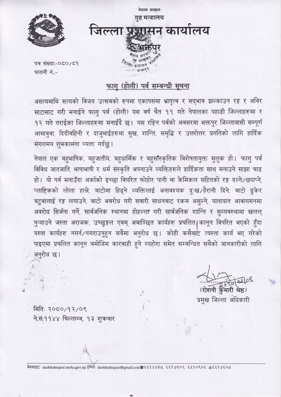 फागु (होली) पर्व मनाउने सम्बन्धी सूचना
