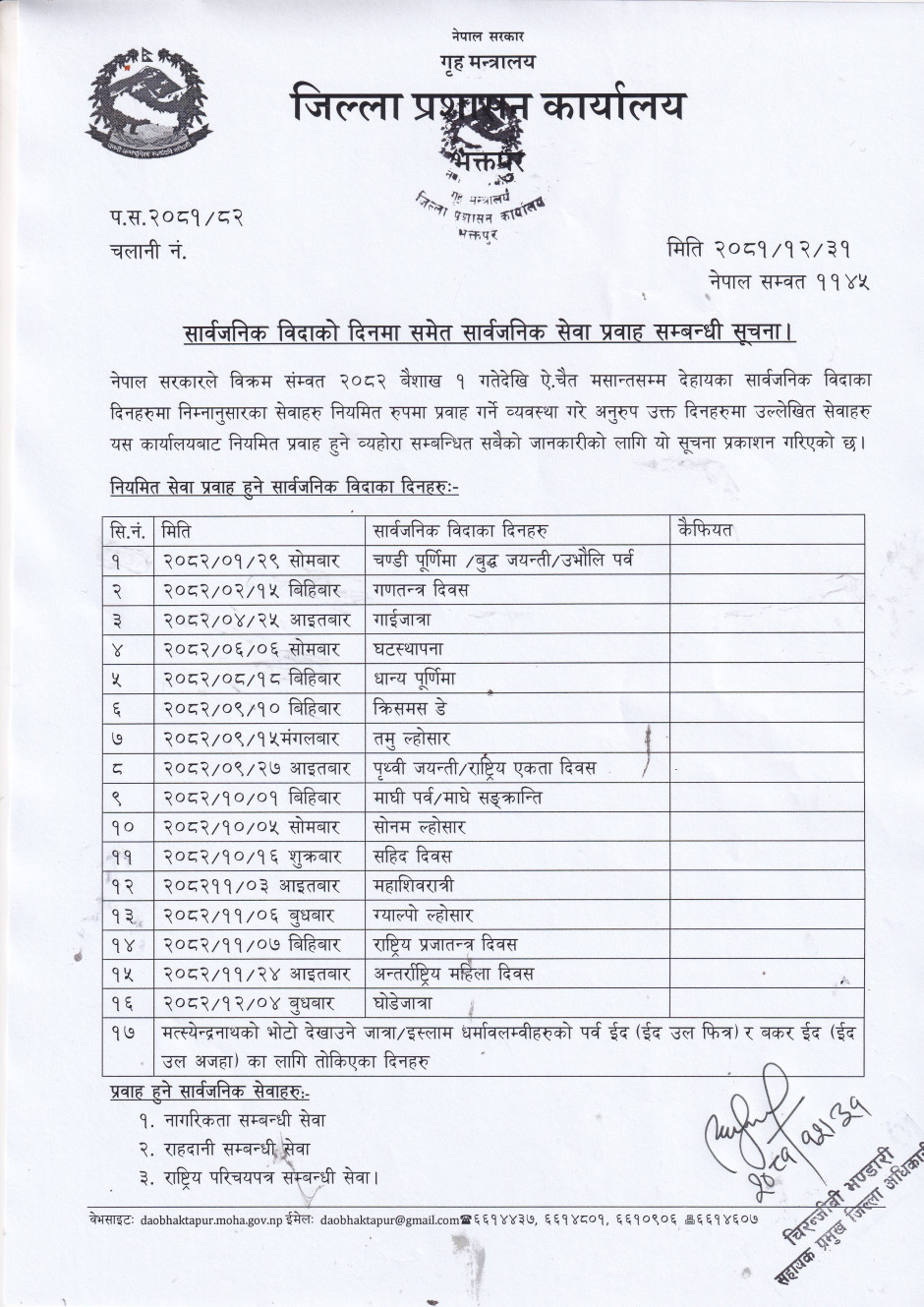 सार्वजनिक विदाको दिनमा समेत सेवा प्रवाह हुने सम्बन्धी सूचना