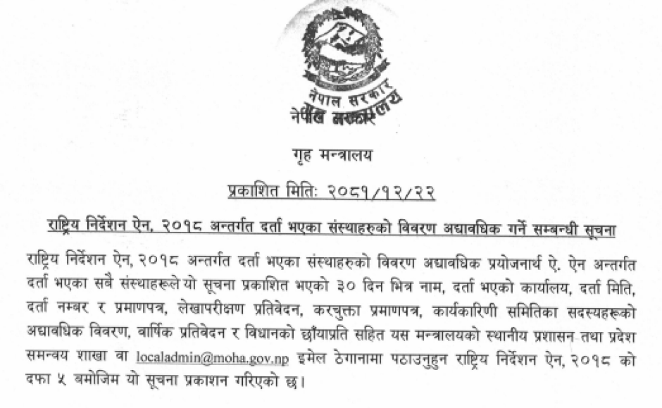 राष्ट्रिय निर्देशन ऐन,२०१८ अन्तर्गत दर्ता भइएका संस्थाहरुको विवरण अध्यावधिक गर्ने सम्बन्धी सूचना