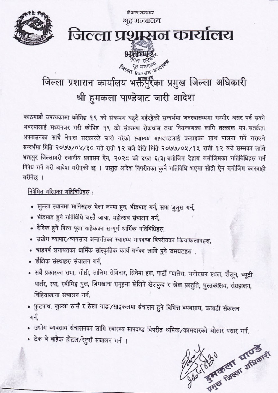 जिल्ला प्रशासन कार्यालय भक्तपुरका प्रमुख जिल्ला अधिकारी श्री हुमकला पाण्डेबाट जारी आदेश (२०७७।०४।३०)