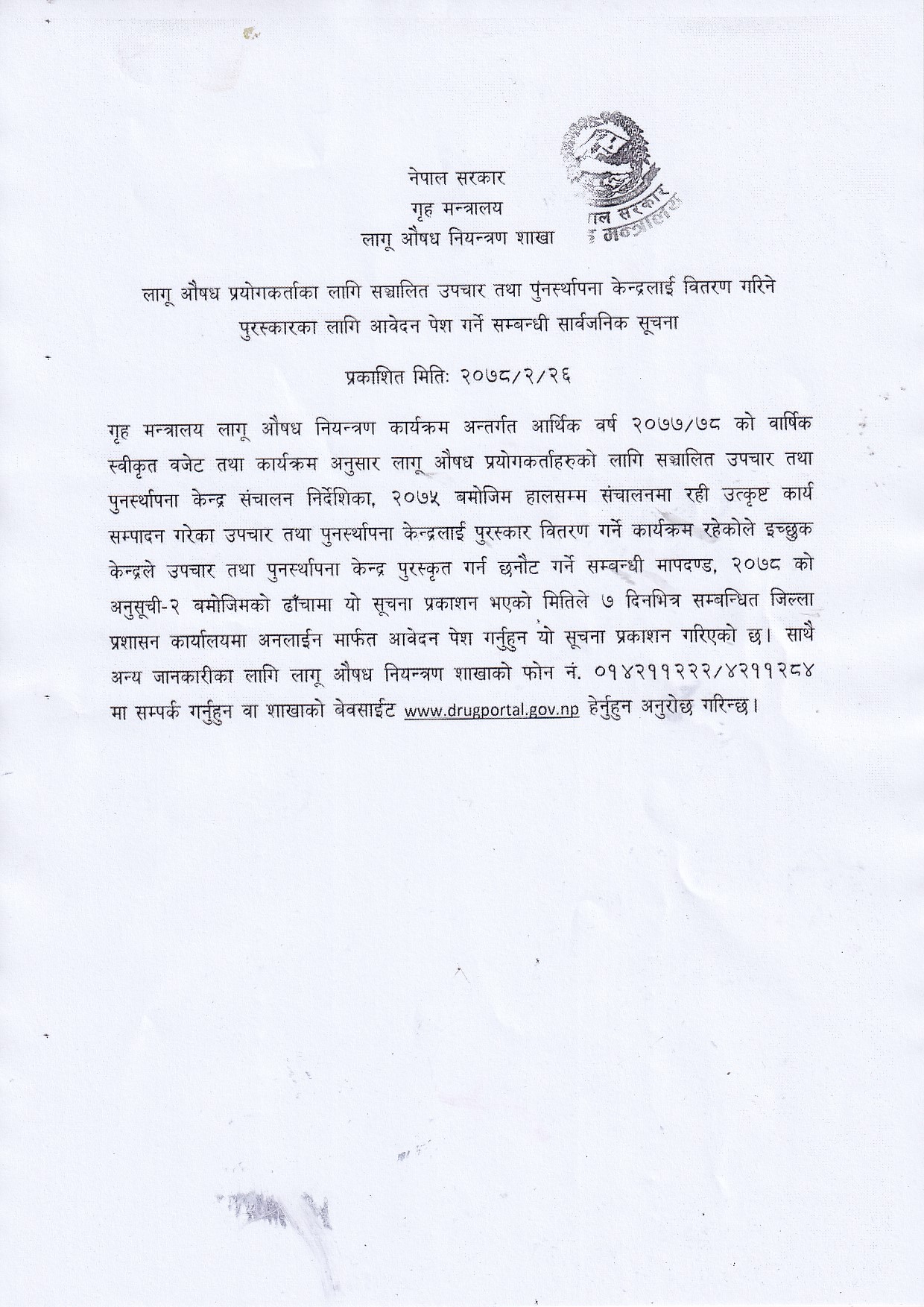 लागु औषध प्रयोगकर्ताका लागि संचालित उपचार तथा पुनस्थापना केन्द्रलाई वितरण गरिने पुरस्कारका लागि आवेदन पेश गर्ने सम्बन्धी सार्वजनिक सूचना (२०७८/०२/२६)