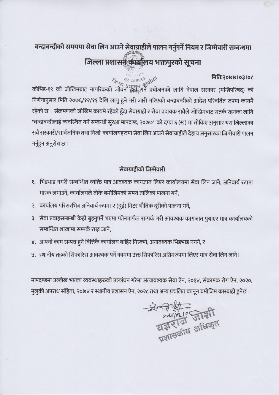 बन्दाबन्दीको समयमा सेवा लिन आउने सेवाग्राहीले पालन गर्नुपर्ने नियम र जिम्मेवारी सम्बन्धमा जिल्ला प्रशासन कार्यालय भक्तपुरको सूचना मितिः२०७७।०३।०८