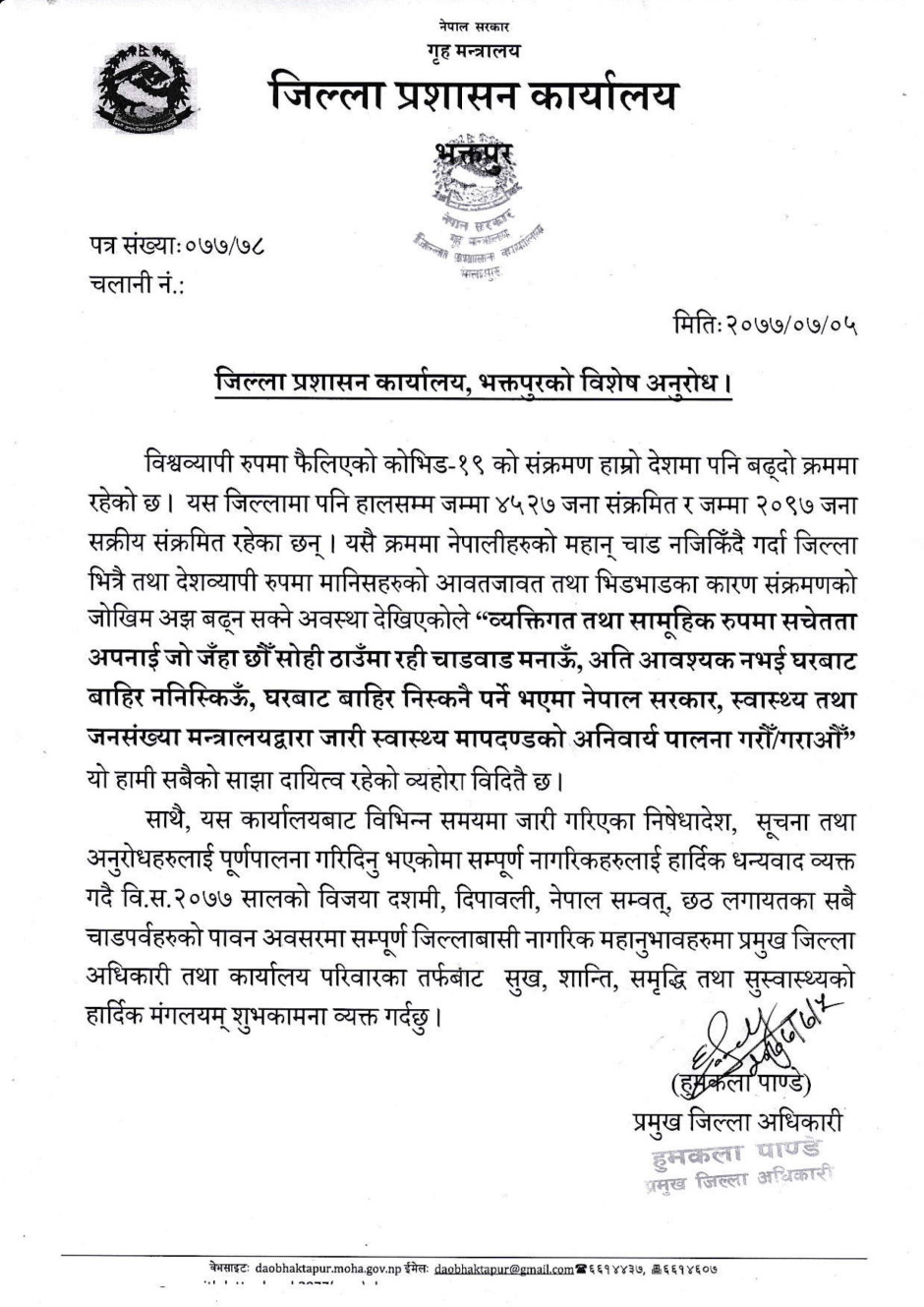 जिल्ला प्रशासन कार्यालय भक्तपुरको विशेष अनुरोध । (२०७७।०७।०५)